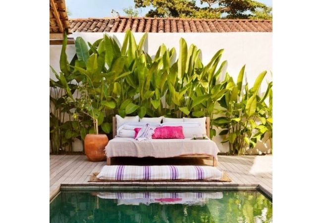 4. Não precisa ter piscina para montar esse espaço com plantas tropicais e um sofá confortável