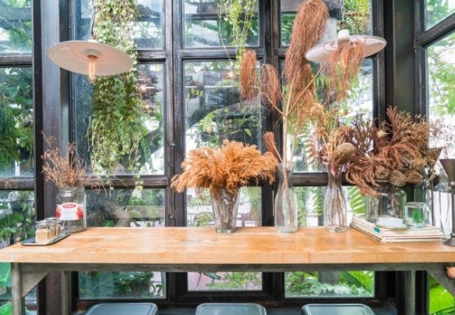 Da mesma forma que o aparador, uma mesa grande pode ser usada como base para os vasos de flor. Claro que também pode servir para fazer refeições, estudar ou trabalhar, com uma linda paisagem a frente.