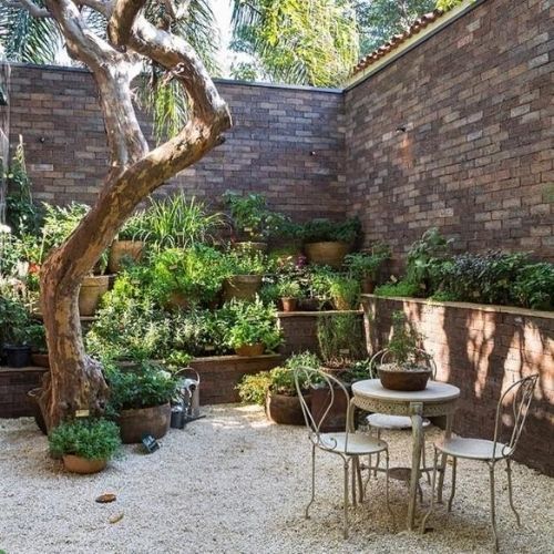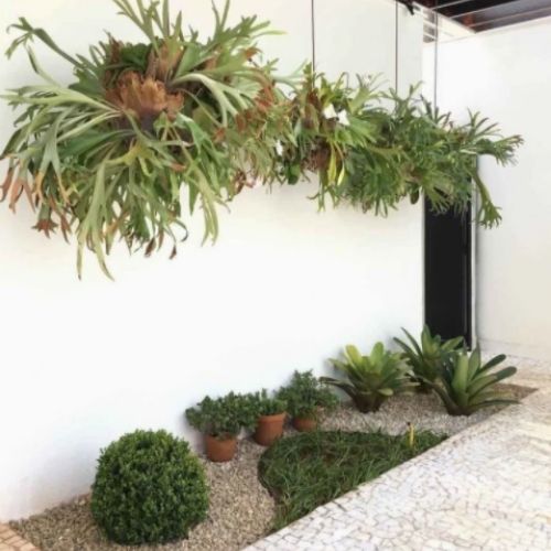 14. Canteiro com pedriscos, plantas no chão e suspensas em um cantinho pequeno