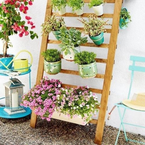 2. Vasinhos pendurados em um estrado de madeira encostado na parede
