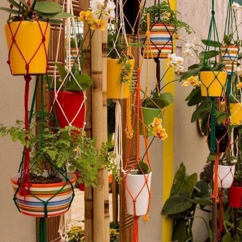 4. Vasos coloridos pendurados em suportes de corda