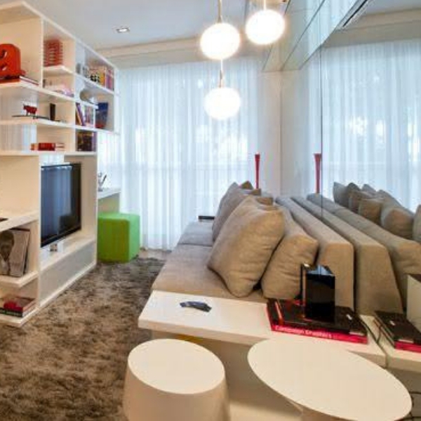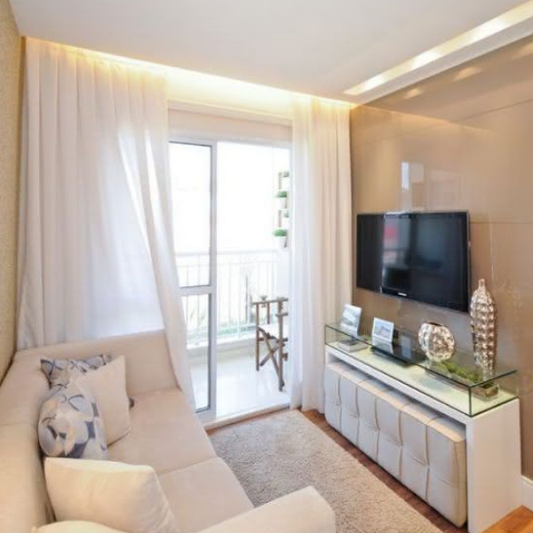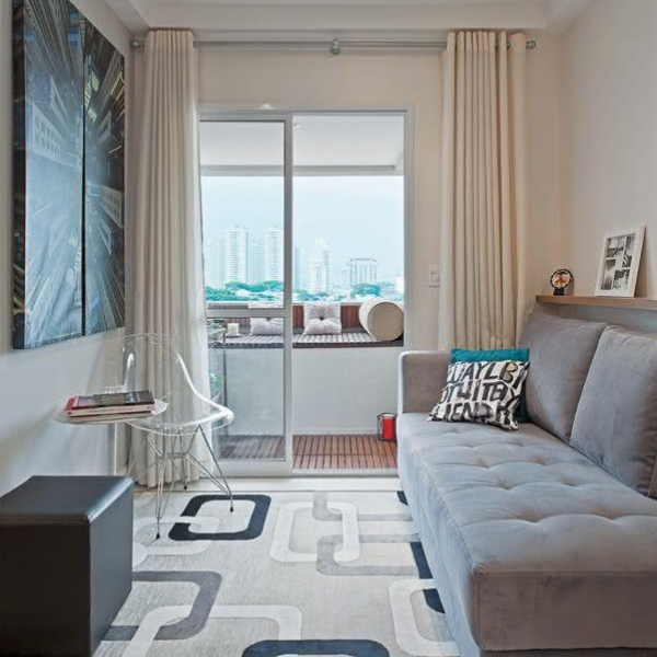 Se a sua sala for bem pequena e quiser uma área mais agradável para que as pessoas possam se sentar, use a sacada. Claro, nesse caso, havendo uma sacada na sala. Para melhor aproveitar o ambiente, use cortinas clarinhas e porta de correr, que possa ficar aberta e melhorar a circulação.