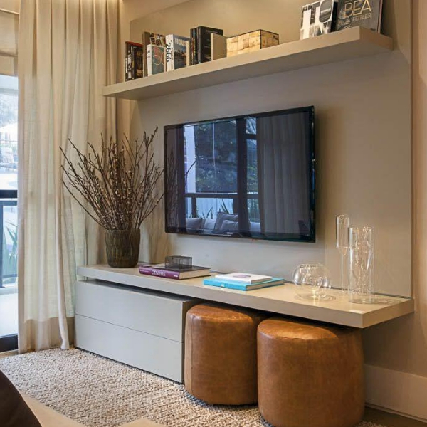 Para otimizar o espaço e criar mais funcionalidade, aposte em móveis que se encaixam. Nesse modelo, os pufes encaixam embaixo do rack, então eles podem abrir espaço na sala quando tiver mais pessoas, ao invés de ficarem no centro para colocar os pés.