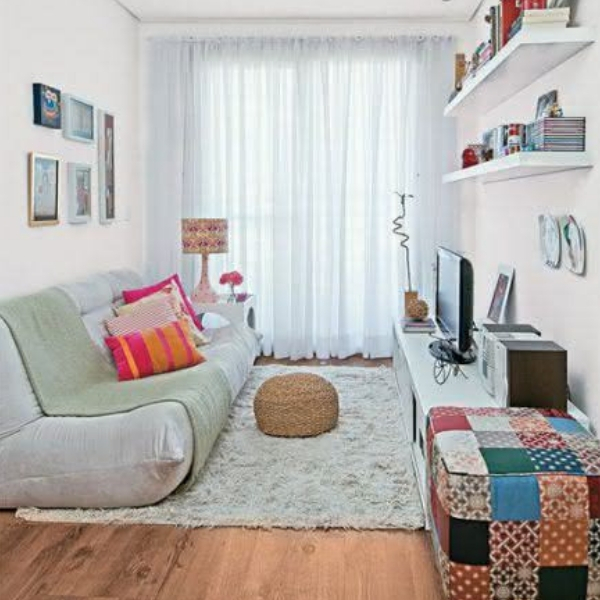 Outro ponto importante é sobre as cores. Como duas das paredes são muito próximas, se utilizar nelas cores muito vibrantes, a sala pode ficar com uma sensação de muito apertada e visualmente cansativa.