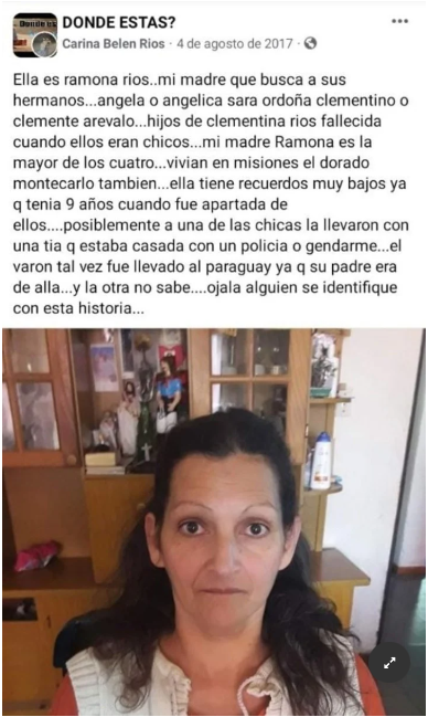 Carina, filha de Ramona, se juntou ao grupo do Facebook chamado “Onde você está? e postou uma foto de sua mãe com a seguinte mensagem: “Minha mãe Ramona é a mais velha dos quatro. Eles moravam em Misiones, El Dorado. Ela tem poucas memórias desde os 9 anos quando foi tirada deles”.