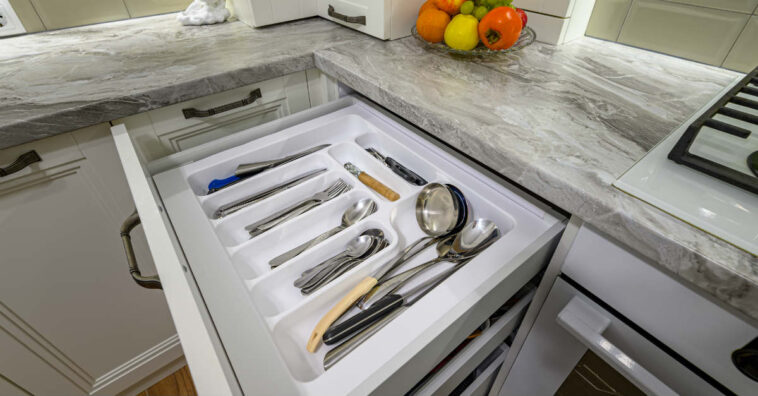 Na primeira gaveta, use divisórias mais estreitas e curtas, que caibam os talheres e algum espaço livre. Nas outras, reserve um espaço somente para panos de prato e outra gaveta para talheres maiores e utensílios. Nelas, você também pode colocar toalhas de mesa, jogos de cozinha, guardanapos e afins.