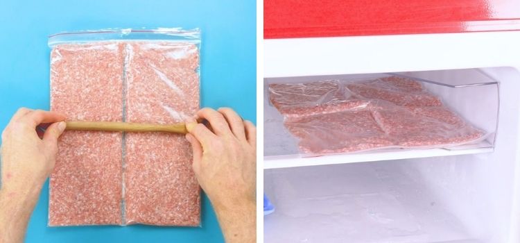 Coloque tudo dentro de um saco plástico grande e use um rolo de macarrão para deixar a carne plana, por igual. O saco precisa ser maior do que a quantidade toda de carne, pois tem que sobrar um espaço.
