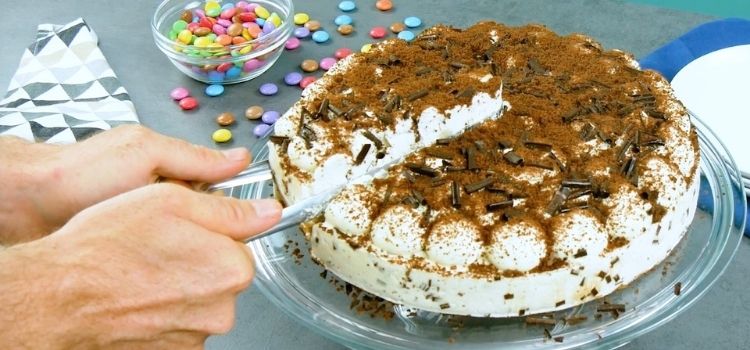 Então, empurre a pinça até a base do bolo, cortando a primeira fatia, e depois faça o mesmo com todo o bolo. Só precisará marcar a parte central do bolo para que todas as fatias fiquem do mesmo tamanho.