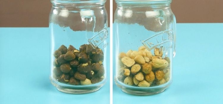 Coloque as avelãs ou amendoins dentro de um pote de vidro com tampa. Essa tampa deve ter um furo, um pouco menor do que o tamanho das avelãs ou amendoins, não muito menor do que isso.
