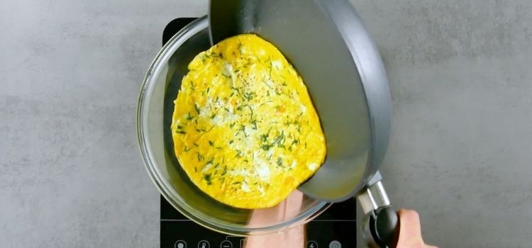 Comece fazendo a omelete normalmente, colocando na frigideira e deixando dourar a parte de baixo. Na hora de virar, pegue um prato raso, despeje com cuidado a omelete sobre o prato, com a parte tostada ainda para baixo.