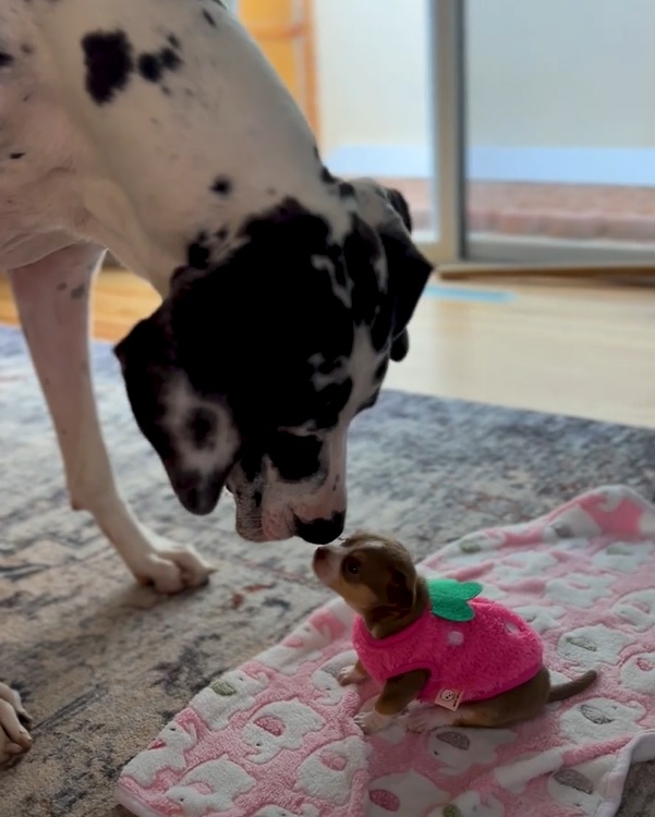 Natalie é o nome da mulher que acolheu dois filhotes minúsculos e recém-nascidos de chihuahua abandonados na beira de uma estrada. Em casa ela tinha uma cadela da raça dogue alemão, que é muito maior do que os minúsculos filhotes.