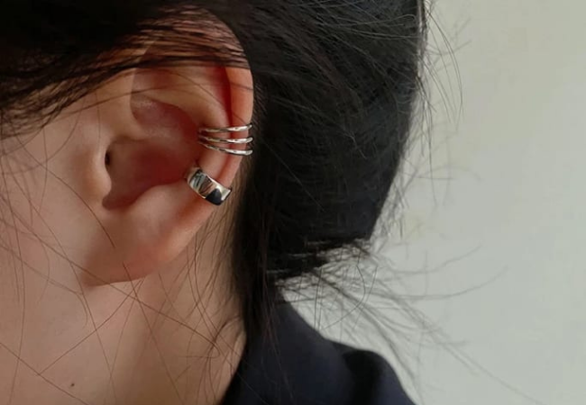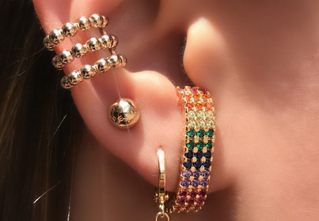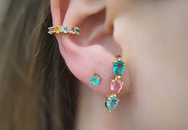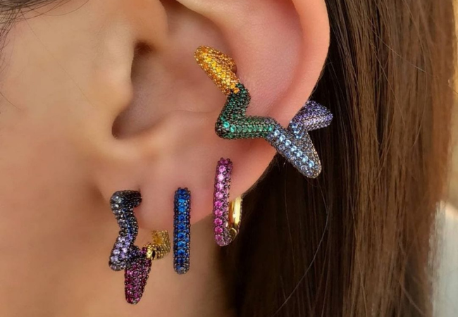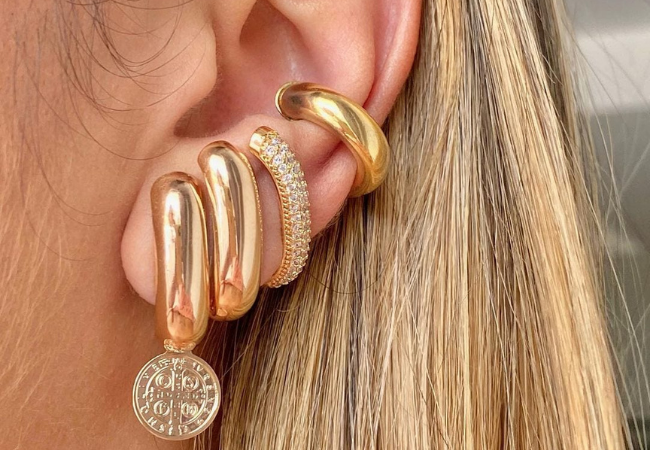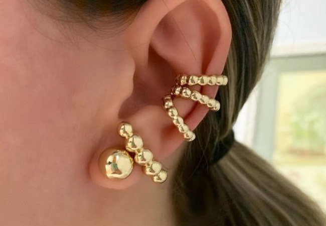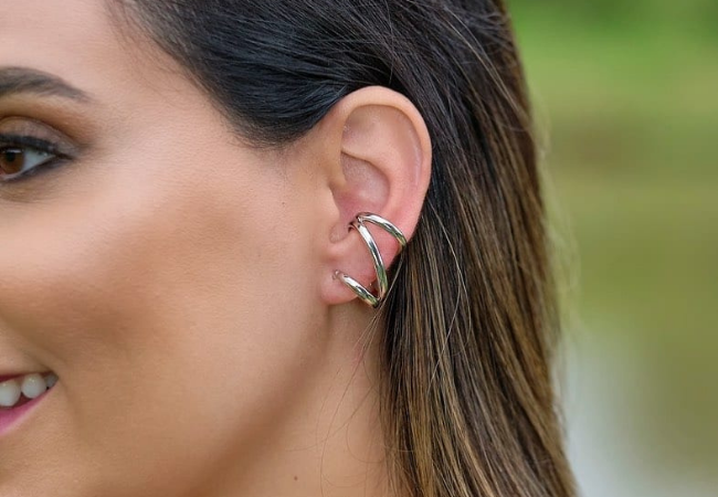 O ear hook é um brinco de encaixe. Ao invés de colocá-lo no furo da orelha, você o encaixa nas curvinhas da lateral da orelha, pois ele tem uma curvatura própria para ficar enganchado e firme nessa posição.