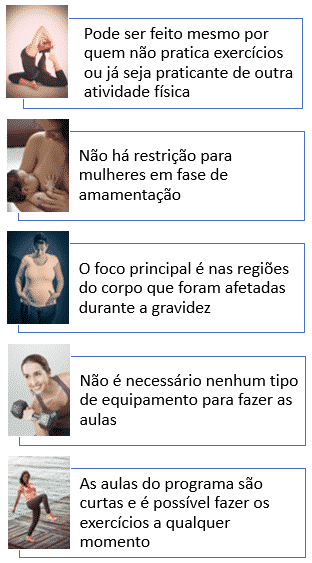 Diferente dos outros programas de emagrecimento, as aulas são direcionadas principalmente para mulheres que já passaram por alguma gravidez e não conseguiu voltar à forma.