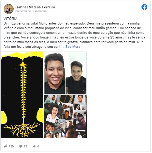 “Nos encontramos na minha casa. Foi bem forte pra mim, pois foi a primeira vez que eu vi alguém tão parecido comigo. Ganhei dela dois presentes: o nome e a foto do aniversário de um ano do meu irmão, que ela recebeu da pessoa que o levou. Ela foi muito importante nessa busca, por me dar nome e rosto de quem estava com ele”.