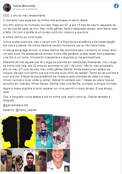 Mesmo com a foto em mãos, Tomaz não sabia como fazer para encontrar o irmão, e ele vivia angustiado para saber se estava tudo bem com seu gêmeo. “Não consigo mensurar as vezes que busquei. Todas as minhas buscas foram por rede social, mas nunca conseguia encontrar. Virava noites na ferramenta que, para mim, era a mais fácil, a mais acessível, a internet”.