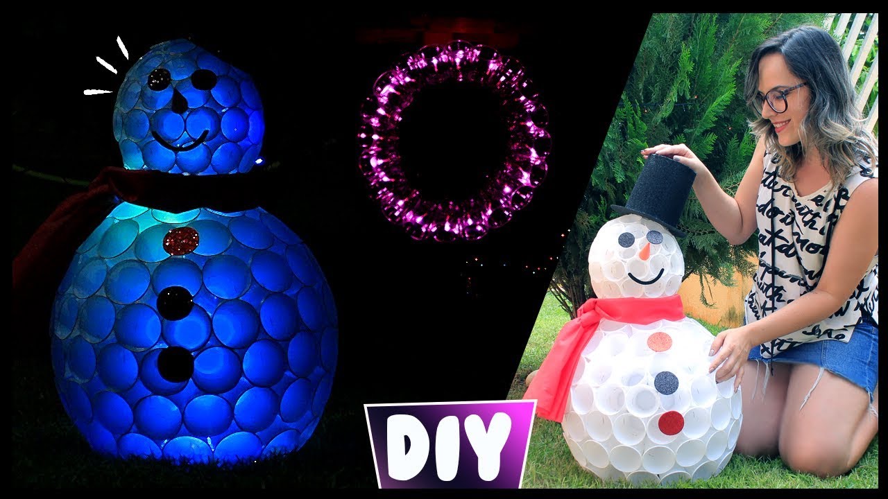 A base dessas ideias são os copos descartáveis de diferentes tamanhos. Você pode fazer um lindo boneco de neve para deixar dentro de casa, na varanda ou no jardim, e também uma guirlanda iluminada para pendurar na porta de entrada. Veja como fazer: