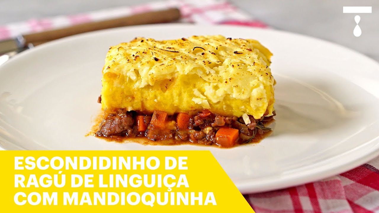 O escondidinho clássico é feito com purê de mandioca, assim como nessa receita. O purê é feito de mandioca misturada com creme de leite e manteiga. Para o recheio, vai precisar de linguiça toscana, cebola, tomate, pimenta de cheiro, pimenta preta e sal. Aprenda a fazer: