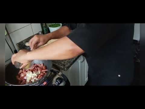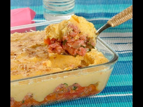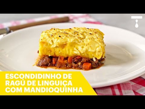 O escondidinho clássico é feito com purê de mandioca, assim como nessa receita. O purê é feito de mandioca misturada com creme de leite e manteiga. Para o recheio, vai precisar de linguiça toscana, cebola, tomate, pimenta de cheiro, pimenta preta e sal. Aprenda a fazer:
