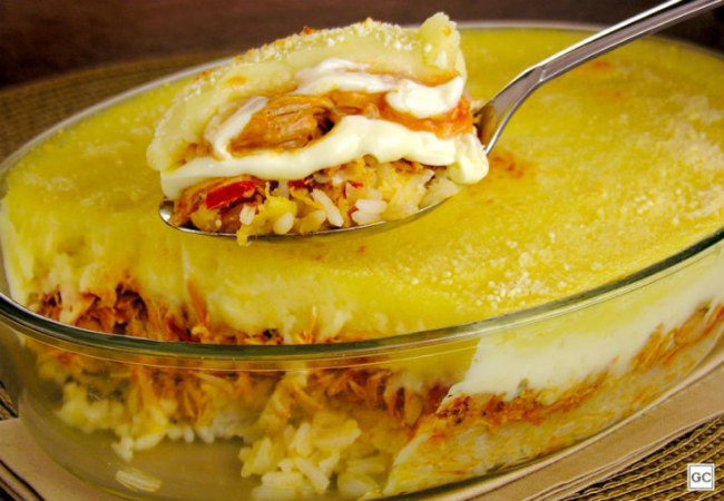 - Comece a montagem com uma camada de purê, outra de frango e o restante do purê por cima. Polvilhe queijo ralado e leve ao forno até gratinar.