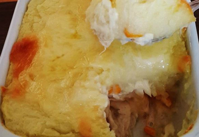 - Então comece a montagem. Faça uma camada de purê, depois uma do frango. Cubra com outra camada do purê.