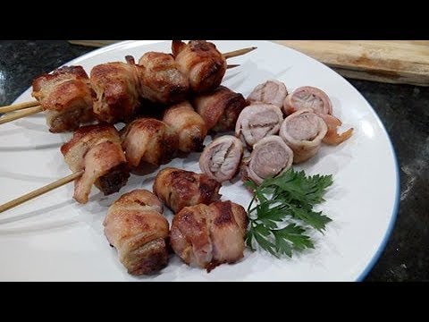 Para os amantes de bacon, essa receita é uma grande tentação, pois o bacon vai enrolado em cada pedacinho de carne do espetinho.