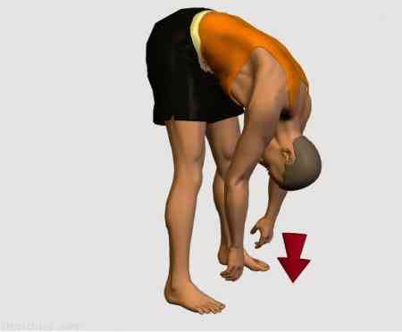 Alongue a coluna ao baixar as mãos em direção aos dedos dos pés. Permaneça uns segundos nesta posição para melhor sentir o alongamento.