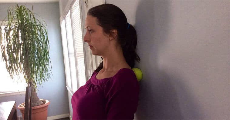 1. Coloque a bola abaixo da clavícula. Exerça pressão contra um canto da parede, enquanto respira fundo;