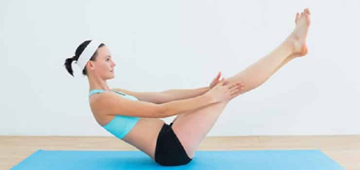 Ainda no chão, sente-se no colchonete com as pernas retas à sua frente. Mantenha a coluna reta, contraia os músculos do abdômen e, lentamente, erga as pernas até formar um V com o corpo.
