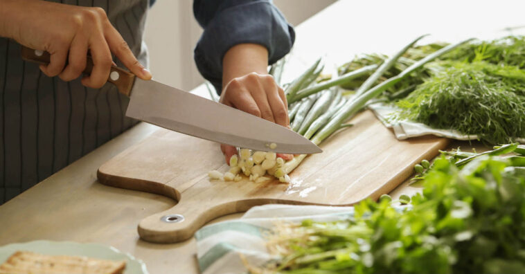 - Pique a carne em fatias finas, no sentido do comprimento das fibras;
