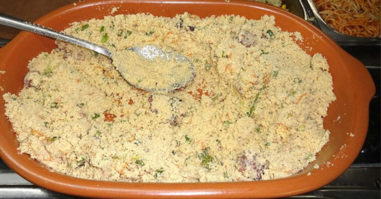Outra substituição para a farinha de mandioca que funciona muito bem como farofa é o cuscuz de milho. Junto desse ingrediente essa opção leva ovos, sal, pimentão verde, salsicha, manteiga, coentro e cebola.