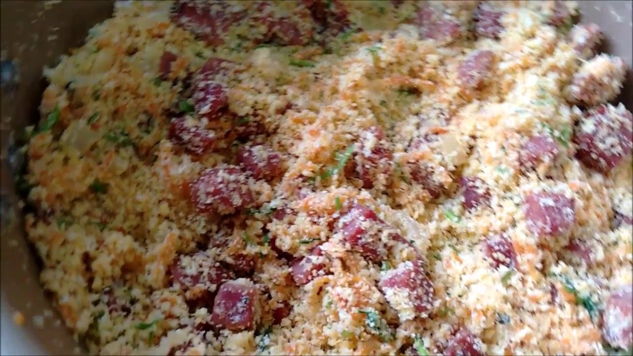 Essa farofa tem o bacon como sabor principal, não leva ovo e fica colorida por causa do cheiro-verde.