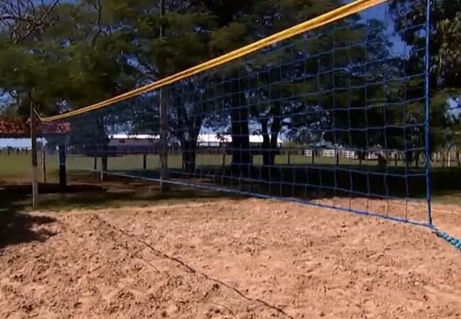 Mas nem tudo é trabalho na fazenda de Leonardo. A estrutura é voltada também para o lazer e esporte. Tanto que possui várias quadras, entre elas, uma das mais utilizadas, a de vôlei, esporte que o cantor gosta de praticar.