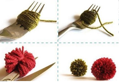 O pompom é a prova de que não é difícil agradar os felinos! Basta pegar um novelo de lã bem colorido e enrolar em torno de um garfo. Quando estiver de bom tamanho passe a linha no meio do garfo e dê um nó.