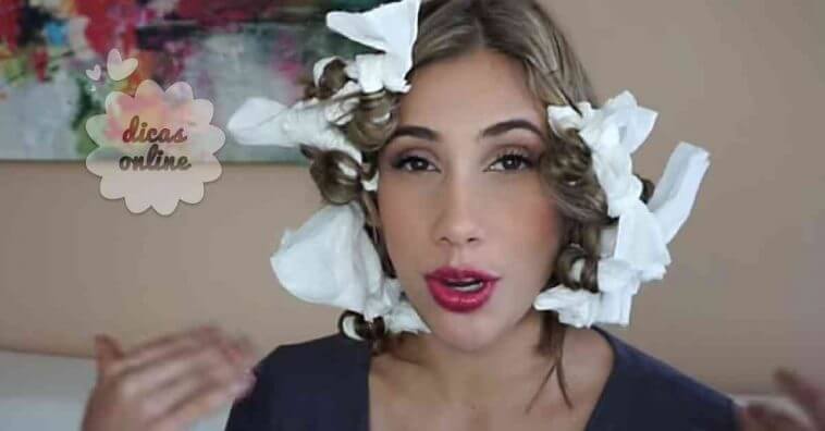 - De seguida, retire uma tira de papel higiênico com o tamanho de cinco quadradinhos e dobre ao meio. A ideia é enrolar o cabelo nessa tira, fazendo rolinhos de papel. Pegue em pequenas mechas e mãos à obra! Comece a enrolar nas tiras! Para prender o cabelo, basta dar um nó com as pontas soltas da tira de papel. Na hora de enrolar, use sempre a mesma direção para manter o penteado uniforme e bonito. Enrolando para trás as mechas ficam mais perfeitinhas.