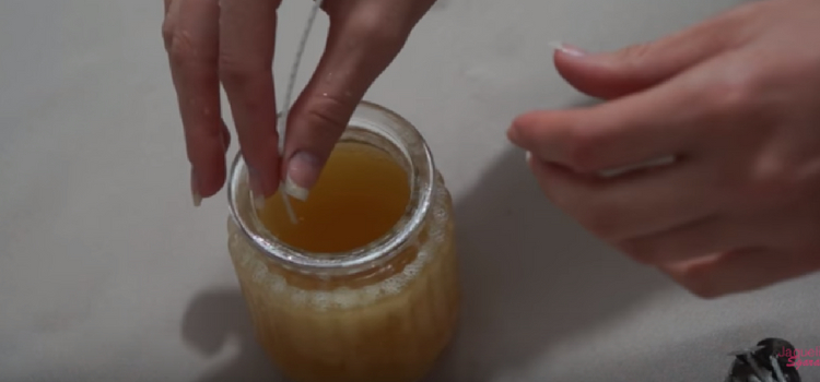 Espere para que a vela comece a solidificar um pouco para conseguir colocar o pavio de modo que ele fique firme no centro da massa. Corte o pavio, que é bem comprido, para ficar do tamanho do pote em que você colocou a vela.