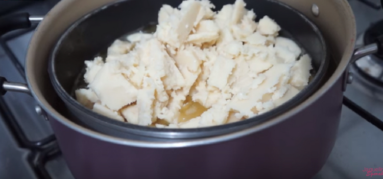 Corte a massa base em pedaços menores e leve em uma panela para que derreta em banho-maria.