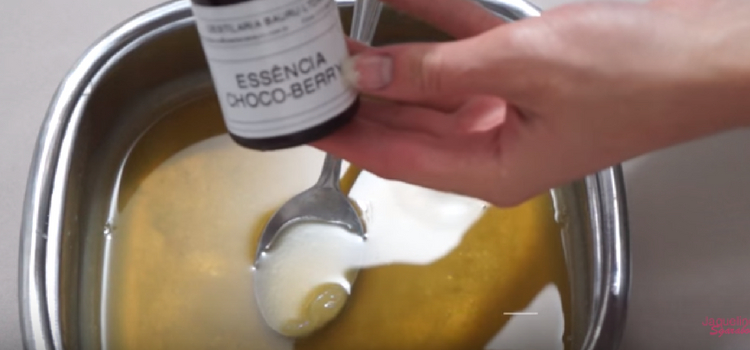 Depois que a massa tiver ficado totalmente líquida, transfira para uma tigela de vidro ou metal e adicione gotas da essência que você escolheu. Se a massa que estava líquida endurecer um pouco, não tem problema, é normal. Derreta em banho-maria de novo, caso aconteça. Misture a massa derretida com a essência até que fique totalmente homogêneo.