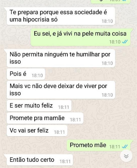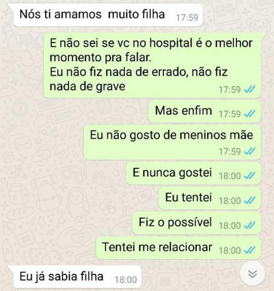 Toda essa situação a deixou cada vez mais corajosa para tentar contar toda a verdade. Quando ela tomou a decisão de falar com os pais, via WhatsApp, teve uma grande surpresa. A mãe dela disse que já sabia, e a alertou para que tomasse muito cuidado com as outras pessoas. Aconselhou também para que ela nunca permitisse ser humilhada por sua orientação sexual. Veja os prints da conversa.