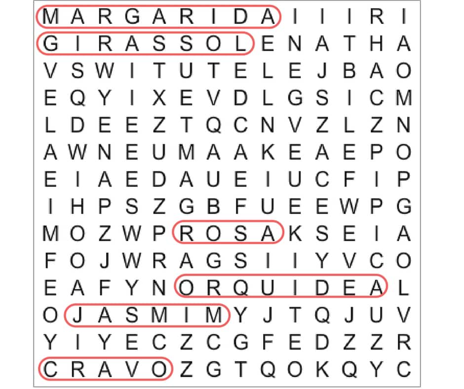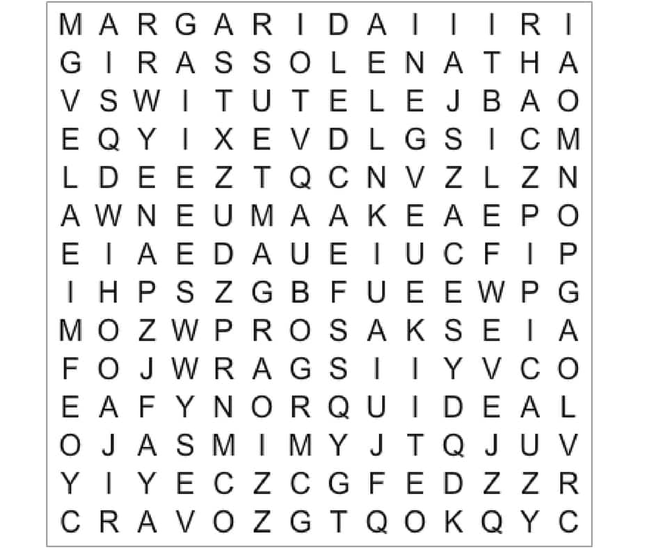 Você gosta do jogo caça palavras? Pois bem, a imagem a seguir é um caça palavras na qual existem 6 nomes ocultos de flores. A primeira a ser encontrada revelará características de sua personalidade.