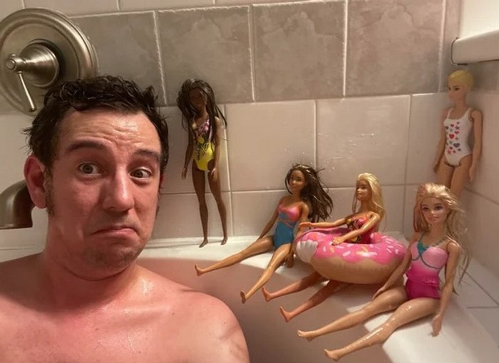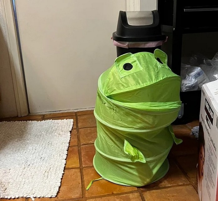 “Meu filho vestido com sua roupa de sapo (cesto de roupas), olhando para mim enquanto estava sentado no vaso sanitário”