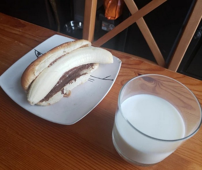 “Meu filho de 5 anos é um gênio. Era isso que ela queria para o café da manhã: banana no pão de cachorro-quente com Nutella e pasta de amendoim, e um copo de leite”
