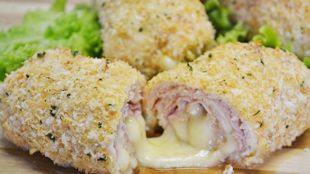 Quer surpreender a todos e fazer uma versão diferente? Faça seu frango empanado com recheio de presunto e queijo.