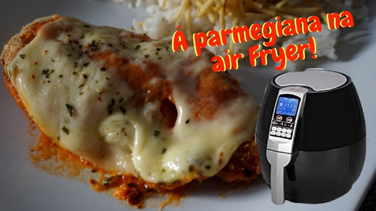 Essa beleza de prato é feito com molho de tomate caseiro, mas pode usar molho pronto se não quiser passar trabalho. Depois de cortar o frango é só empanar, levar para fritar na Airfryer, depois montar em uma travessa com o molho e queijo. Veja como é prático: