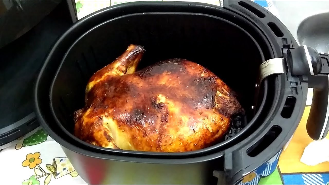 Quer fazer um frango inteiro, com pele crocante e carne bem macia? Só precisa escolher um tamanho que caiba no cesto da fritadeira. O tempero usado nessa receita é sal, louro, orégano, açafrão, suco de laranja puro, catchup, mostarda e molho de pimenta. Veja o passo a passo: