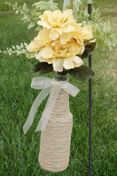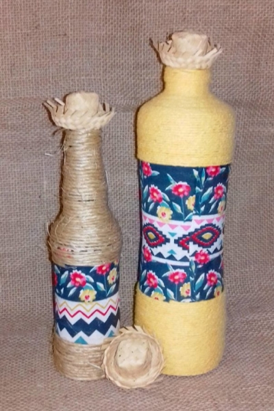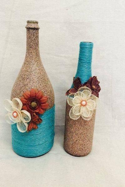 O método para fazer garrafas de vidro decoradas com barbante é muito simples. Você só precisa ir enrolando o barbante em volta da garrafa, da base ao gargalo, enquanto vai aplicando cola no vidro para que o barbante fique bem fixado. Com esse método pode criar diferentes modelos, com detalhes em outros materiais e cores variadas.
