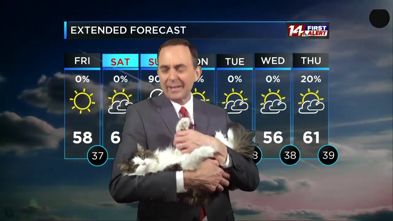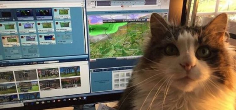 Não foram filhos, esposa, mãe nem pai. Quem entrou no escritório do jornalista foi Betty, sua gata. Ele estava em meio à transmissão da previsão do tempo, quando Betty apareceu e ele ficou ligeiramente constrangido.
