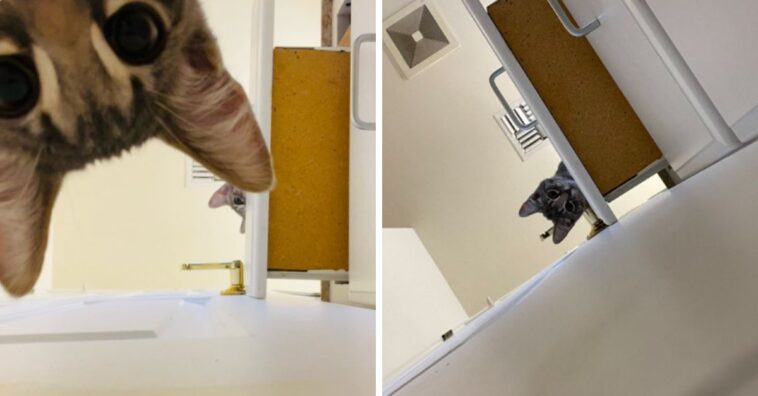 “Nossos gatos abriram a gaveta do armário do banheiro, bloqueando assim a abertura da porta. Tirei essa foto colocando meu telefone embaixo da porta. Tentando com um cabide fechar a gaveta para poder abrir a porta. Um cachorro nunca faria isso”, disse ela na legenda.