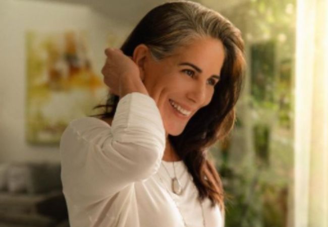 Glória, que está com 57 anos, é um perfeito exemplo de como o cabelo grisalho pode rejuvenescer. Quando o corte é benfeito, o cabelo é bem cuidado e a pessoa está de bem com a vida, tudo isso conspira a favor de um visual jovial, que emana felicidade.
