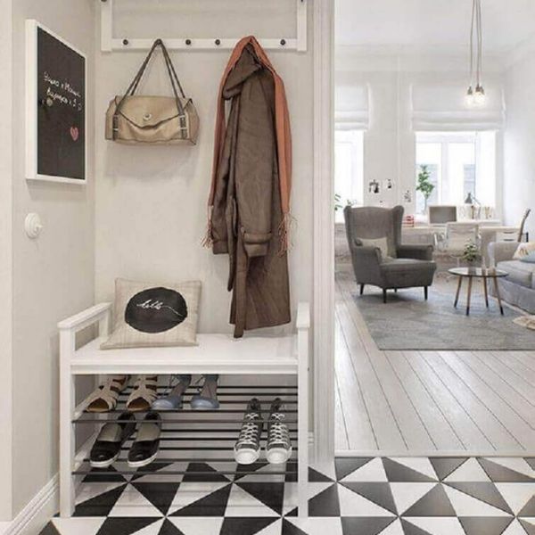 Gosta de uma decoração leve, neutra e funcional? Faça do seu hall um espaço para pendurar casacos, guarda-chuvas e use um baú para sentar e tirar os sapatos. Aliás, também pode servir como sapateira.