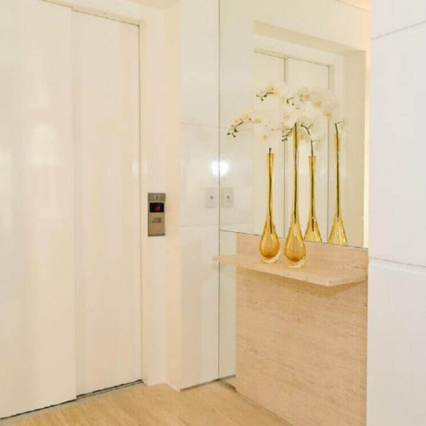 Simples, mas sofisticado. Assim é esse hall com um aparador de design bem simples que pode ser feito em MDF ou, se quiser, investir mais para deixar luxuoso, pode fazer em mármore carrara. Fica divino.